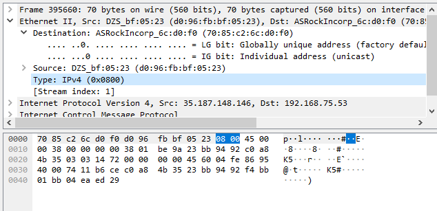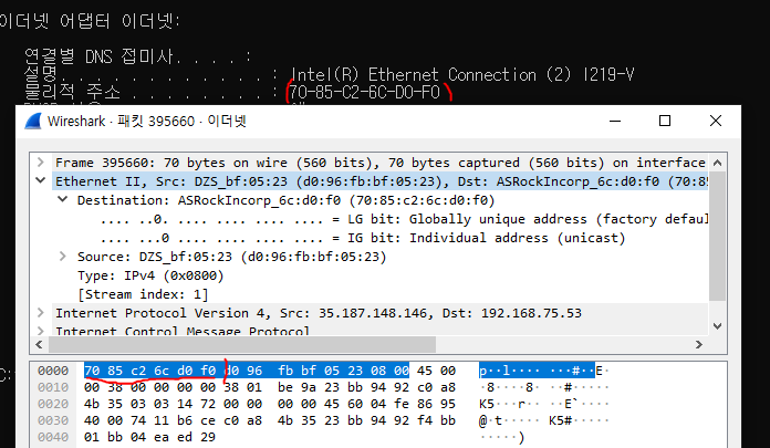 출발지 주소 : 70:85:c2:6c:d0:f0 가 내 ip 물리적 주소와 일치하는 것을 볼 수 있다.