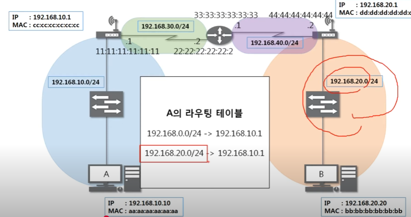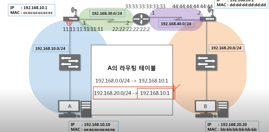 초반부에 A 라우팅 테이블을 확인할 때 B의 주소로 가기 위해서는 A의 게이트 위치를 알려주고 있다.