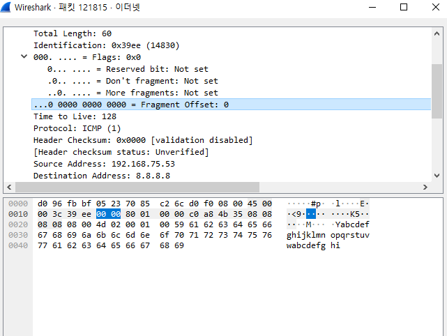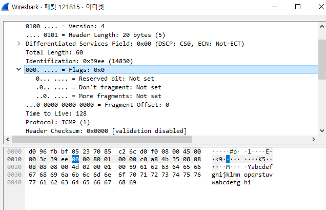 플래그 값은 조각화 여부를 알려주는 값이다. 총 3비트이다. 잘 쓰이지 않는다.