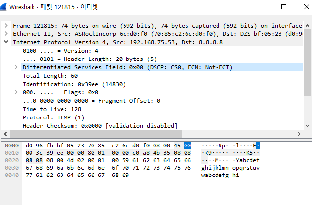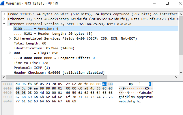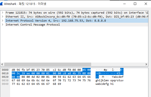 ICMP 프로토콜의 모습이다. 간단한 8바이트 뒤에 임의의 알파벳이 붙어 있다.