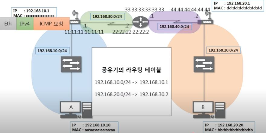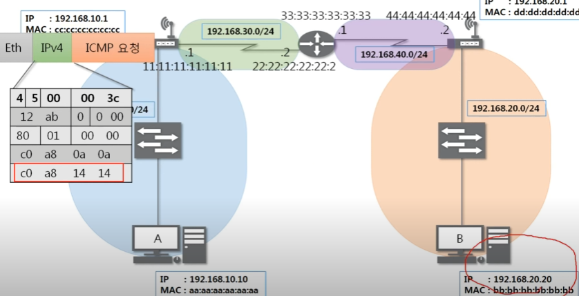 목적지와 출발지 맥주소를 본인의 옆 네트워크 대역과 통신할 수 있는 것으로 변경한다.