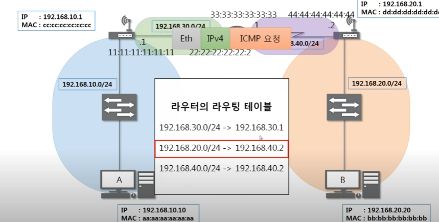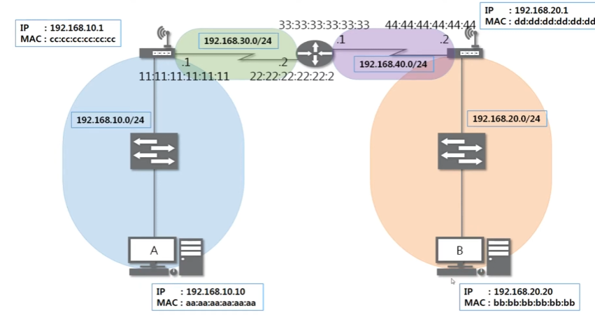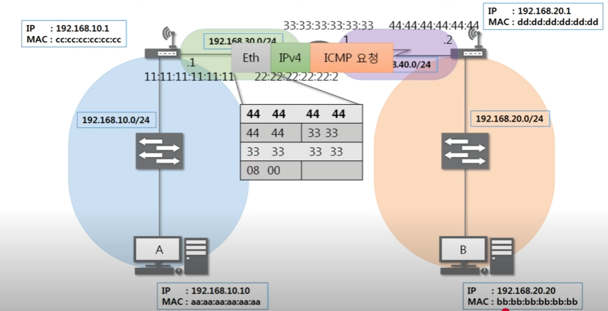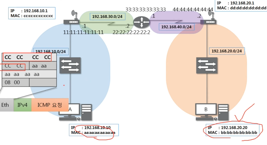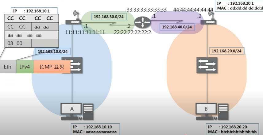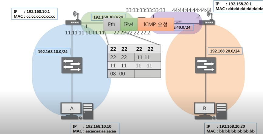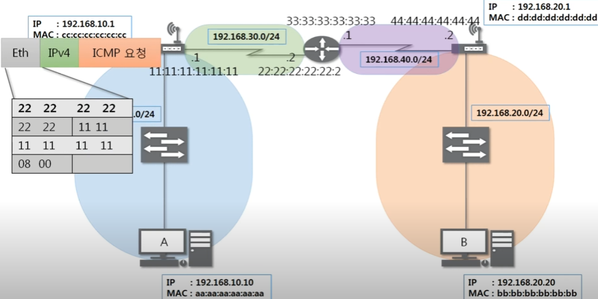 최종 목적지 주소는 B이지만 이더넷은 LAN에서 통신할 때 쓰이는 프로토콜이다.