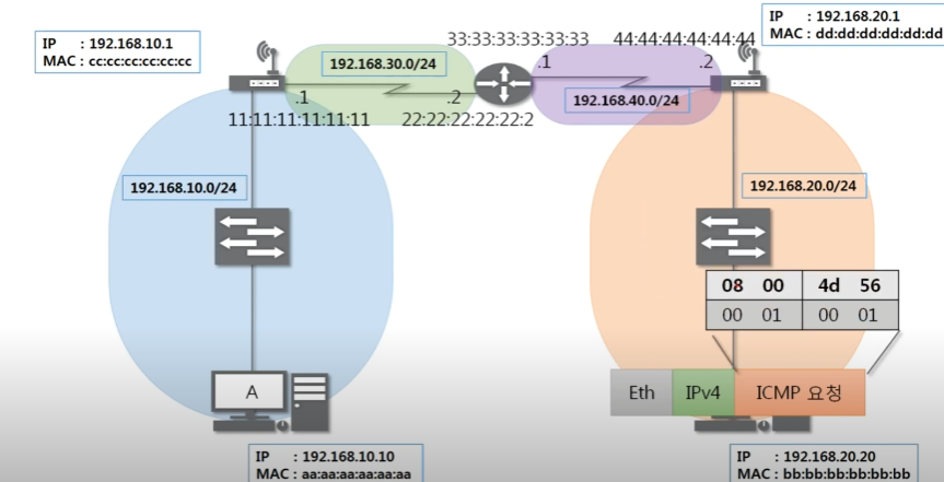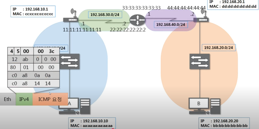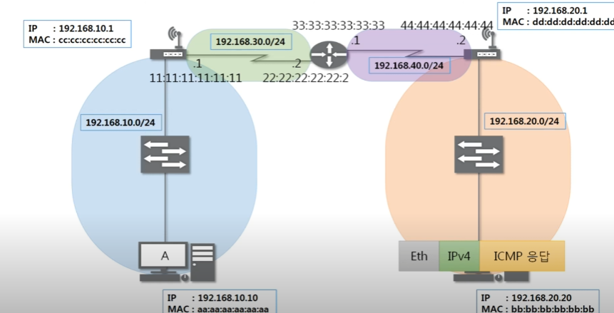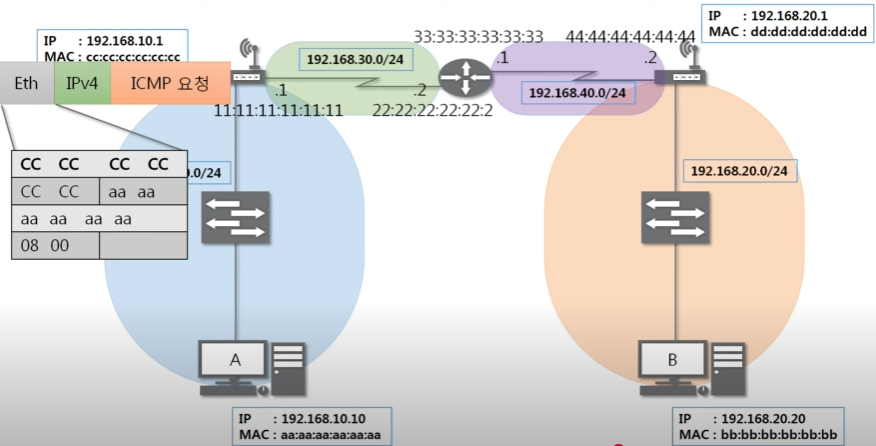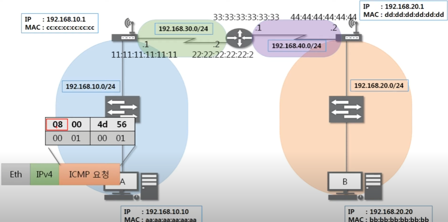 최종적으로 패킷이 도착한 B는 패킷을 가본 후 ICMP 요청(08)이 왔다는 것을 확인 후 ICMP 응답(00) 프로토콜을 만들어 반대로 다시 보내준다.
