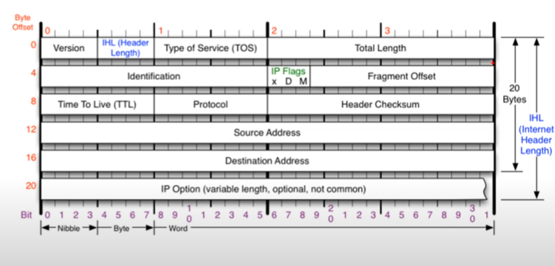 플래그 : 플래그(Flags)는 패킷의 분할 여부에 대한 정보를 나타내는 3비트의 영역이다. 첫 번째 비트는 예비용을 항상 0으로 설정하며, 두 번째 비트는 DF(Don't Fragment), 세 번째 비트는 MF(More Fragment)이다. DF는 데이터를 단편화할 것인지 판단하는 역할을 하며, 0이면 분할이 가능하고 1이면 분할하지 말라는 의미이다. MF는 단편이 더 있는지 판단하는 역할을 하며, 0이면 마지막 단편이라는 뜻이고 1이면 아직 수신되지 않은 단편이 있다는 의미이다.