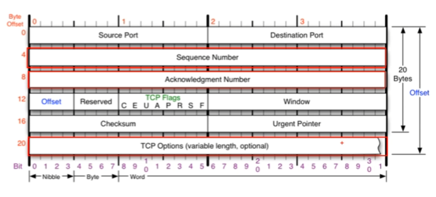 시퀀스 넘버, Ack Num 을 보낸다. Offset 길이는 헤더의 길이를 4로 나는 값 5가 셋팅되어 있다. reserved 는 사용하지 않는다. Syn Flag 가 셋팅되어 있고 그 이후 window , check sum 등이 셋팅되어있다.