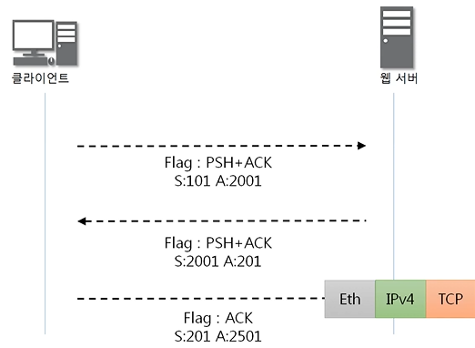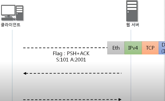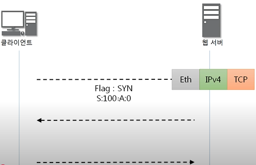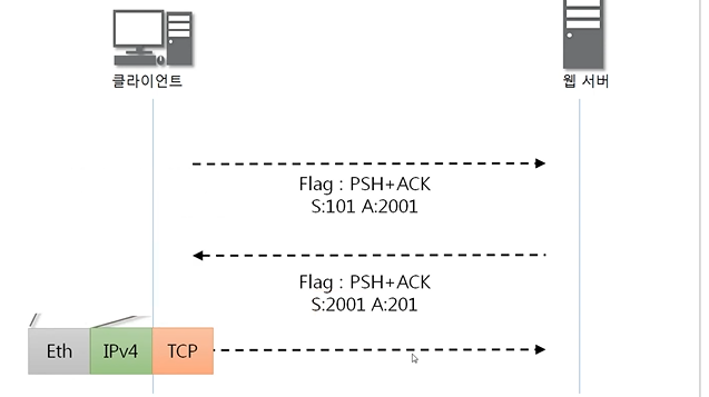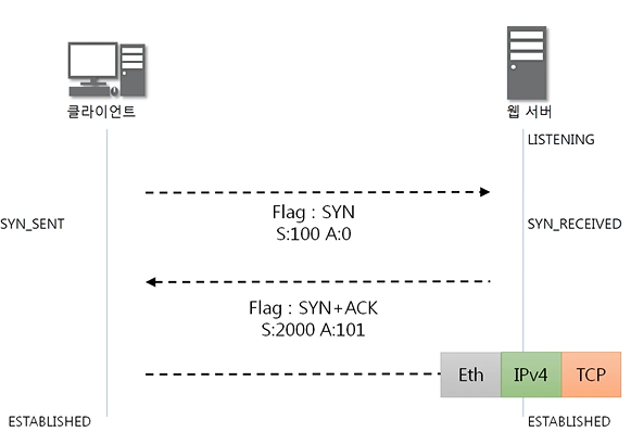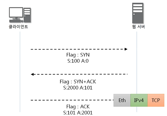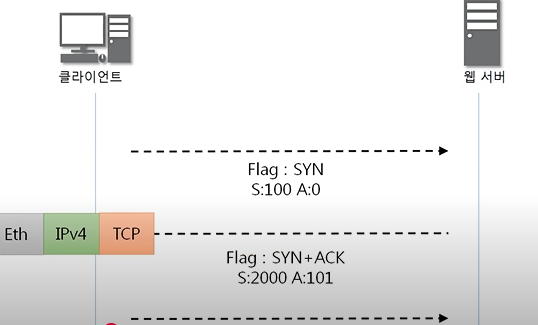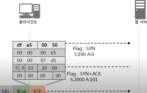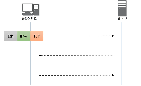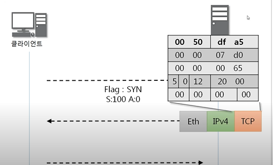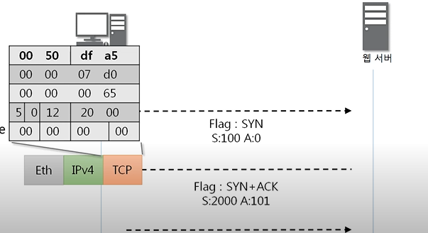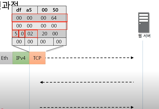 요청을 받은 웹서버는 Eth -> IPv4 -> TCP 순서로 디캡슐레이션하여 정보를 확인한다. Flag 값을 확인하여 본인에게 연결요청을 하는것을 판단하고 응답을 보낸다.