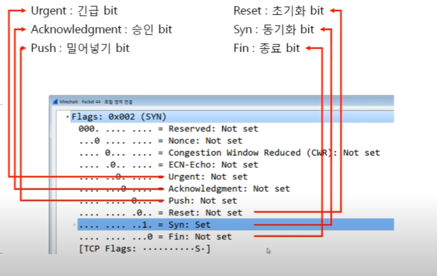 TCP Flags (중요) : TCP 헤더에 포함되어 있는 제어비트로, TCP 세그먼트의 상태와 연결 상태를 관리하는데 사용된다.