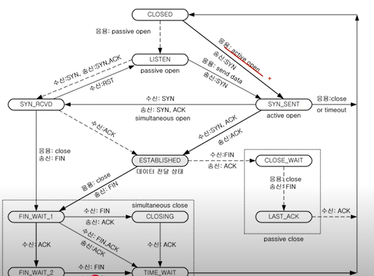 LISTEN 상태 : 4계층에서 사용하는 포트 번호를 열어 놓고 있는 상태