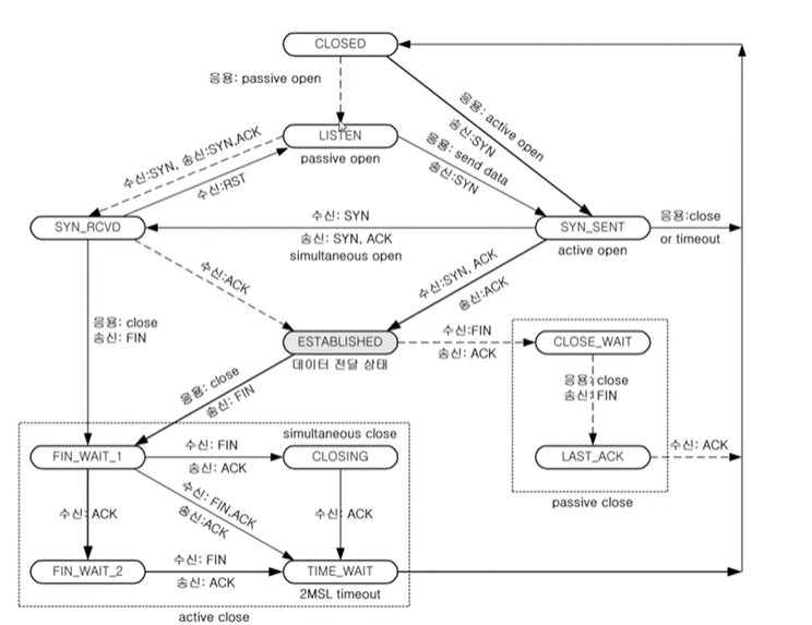 ESTABLISHED 상태: 연결이 서로 수립된 상태 - 클라이언트와 3way hadshake 과정이 끝나면 ESTABLISHED 상태가 됨 ESTABLISHED 상태가 되야 통신이 가능해진다.