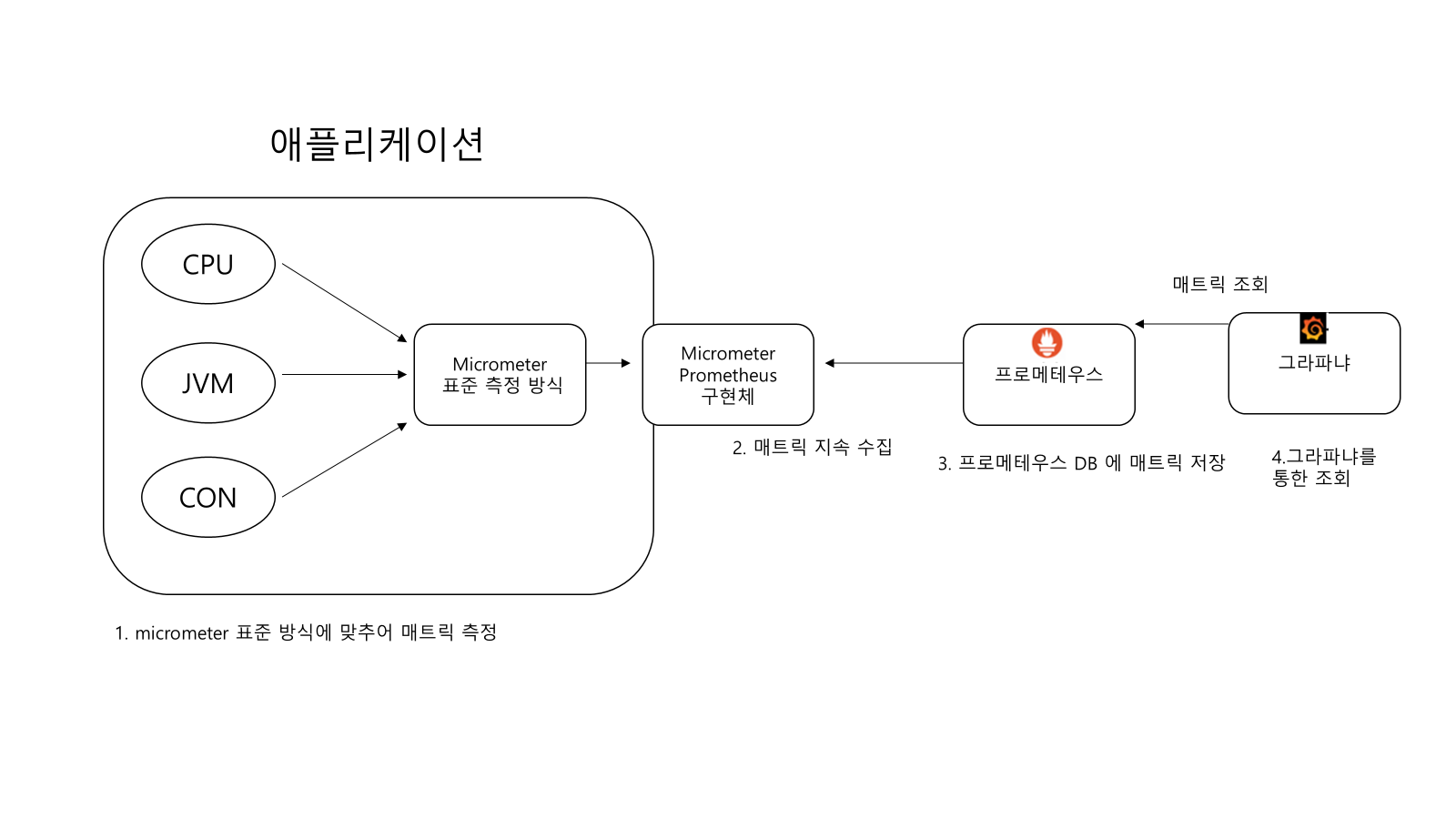- 애플케이션 설정: 프로메테우스가 애플리케이션의 메트릭을 가져갈 수 있도록 애플리케이션에서 프로메테우스 포맷에 맞추어 매트릭 만들기