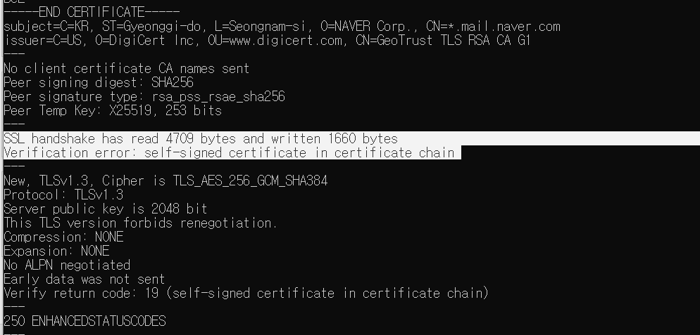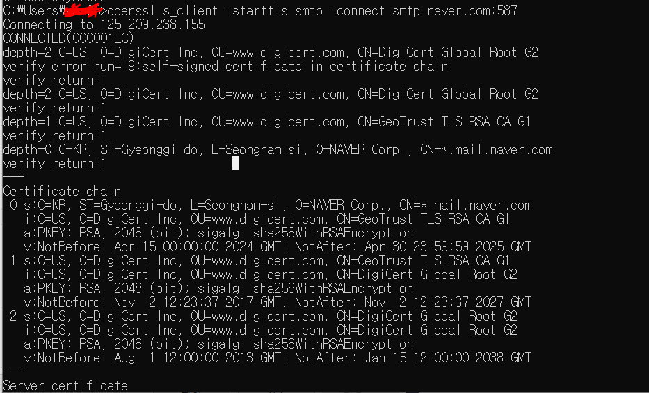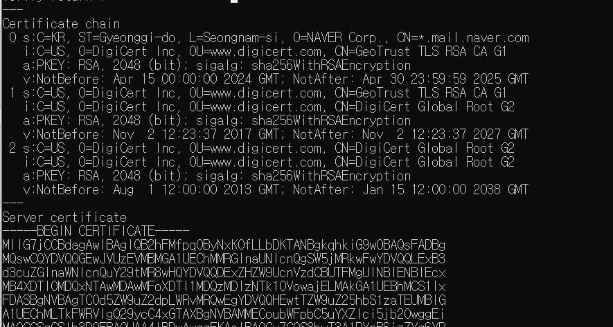 서버가 클라이언트에게 인증서를 보낼 때, openssl s_client는 이를 출력합니다. 이 부분을 통해 서버의 인증서가 무엇인지 확인할 수 있습니다.