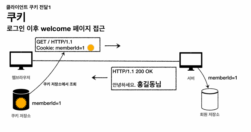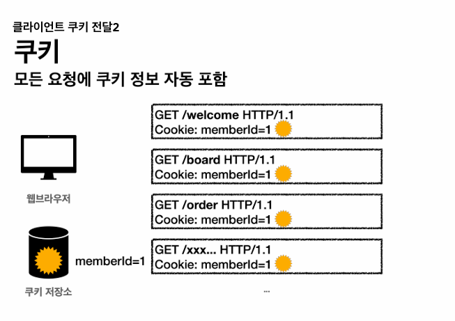 - 이 정보가 웹 브라우저에도 보관되고, 네트워크 요청마다 계속 클라이언트에서 서버로 전달된다.