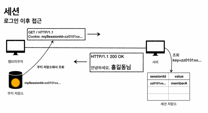 서버에서는 클라이언트가 전달한 mySessionId 쿠키 정보로 세션 저장소를 조회해서 로그인 시 보관한 세션 정보를 사용한다.