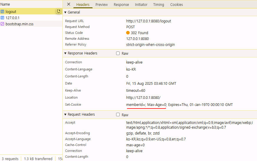 로그아웃도 응답 쿠키를 생성하는데 Max-Age=0 를 확인할 수 있다. 해당 쿠키는 즉시 종료된다.