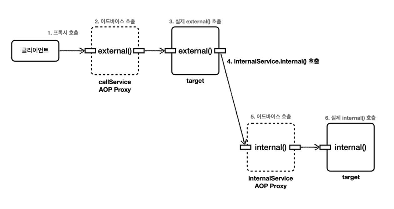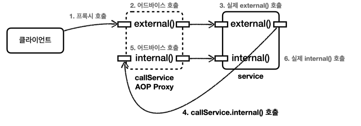 외부에서 호출하는 경우 프록시를 거치기 때문에 internal()도 CallLogAspect 어드바이스가 적용된 것을 확인 할 수 있다.