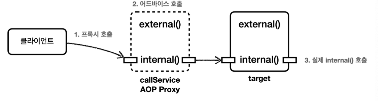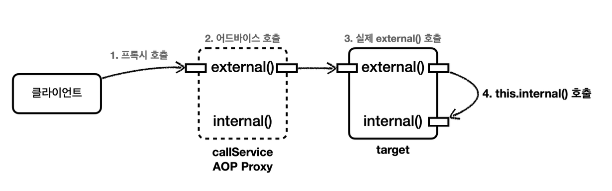 외부 호출 → 프록시 객체 → 대상 객체 메서드 → this.내부메서드() (프록시 우회)