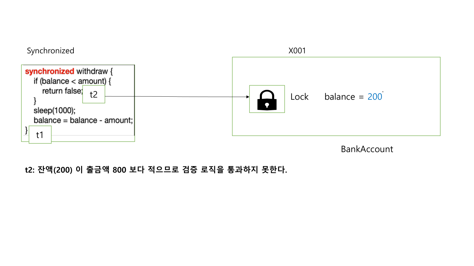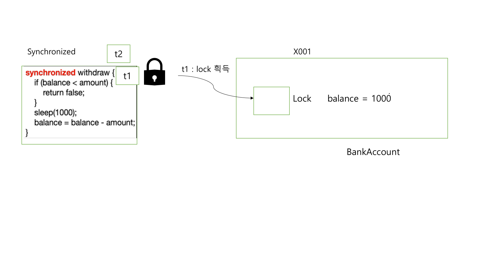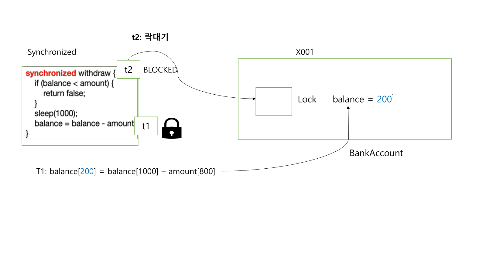 - 락이 있으므로 스레드 t1 은 BankAccount(x001) 인스턴스에 있는 락을 획득한다.
