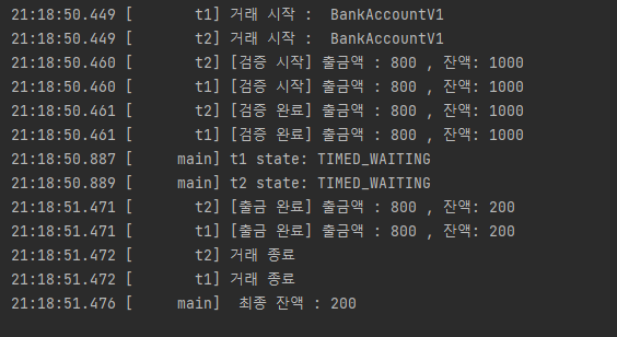 t1 은 800원 출금에 성공하지만, t2는 잔액 부족으로 출금에 실패한다. 그리고 최종 잔액은 1000원에서 200원이 돼 프로 정확하게 맞다.
