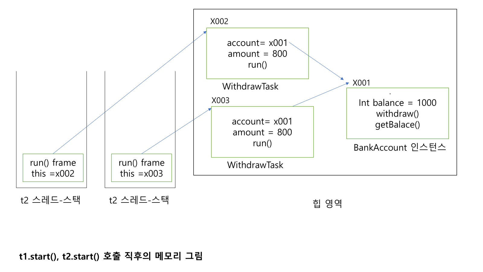 스레드 t1, t2는 withdraw()를 실행하기 직전이다.