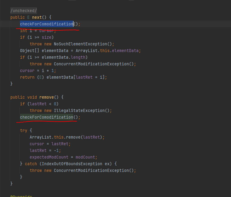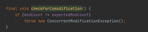 iterator 내부 메서드에서 checkForComodification 부분에서 expectedCount와 modCount 가 같지 않을 경우