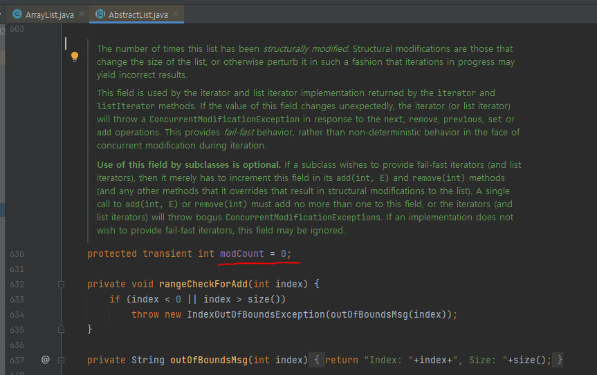 add(), remove(), clear() 같은 메서드가 호출되면 modCount 값이 증가한다.