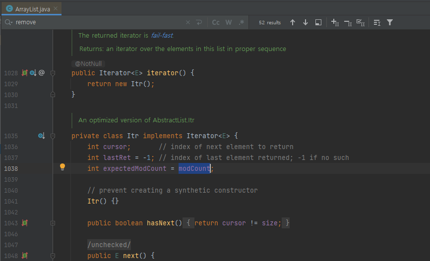 ArrayList에 내부 로직을 보면 Interator 생성시점에 expectedModCount에 modCount를 저장하는 것을 확인할 수 있다.