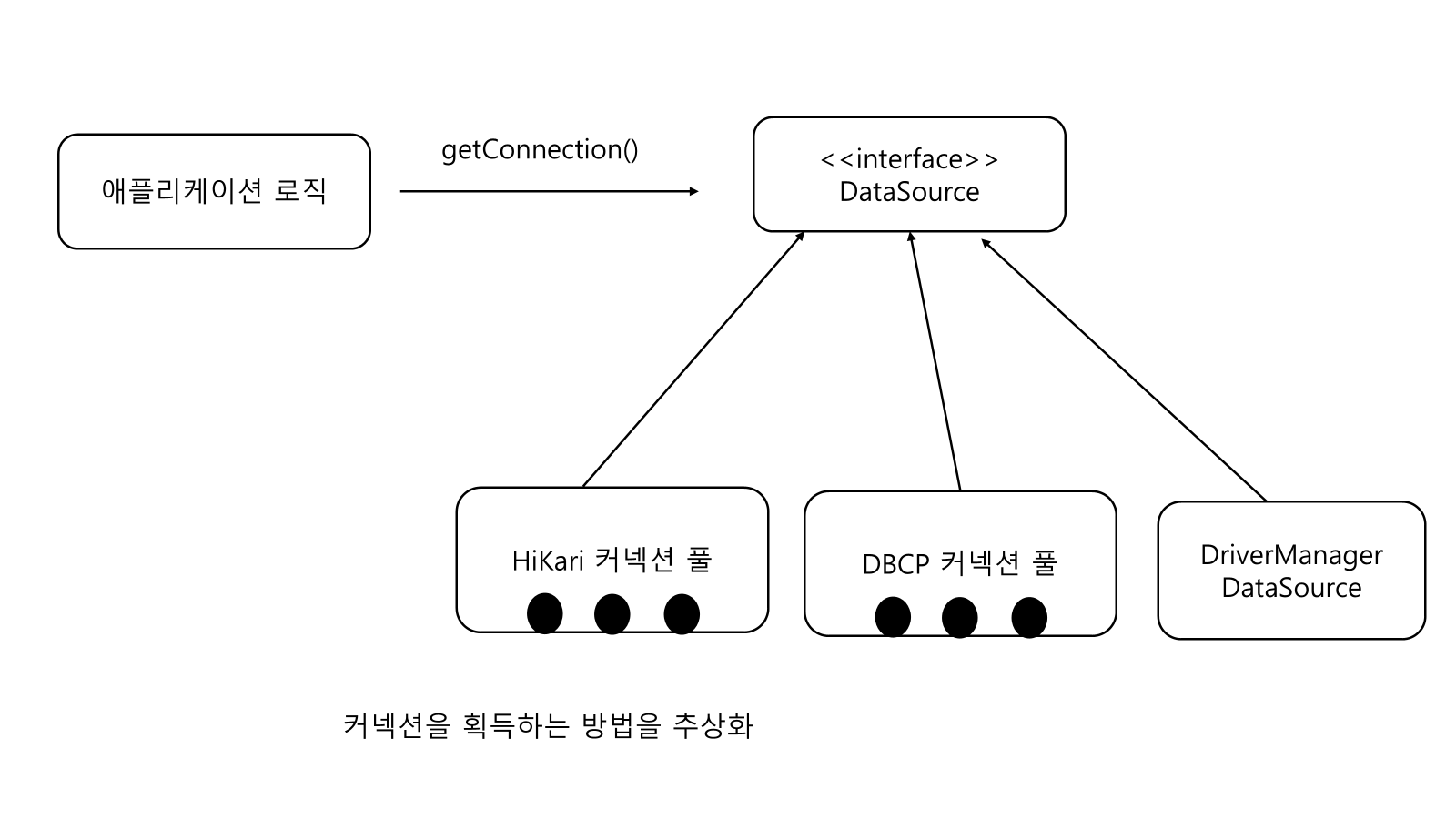 - 자바는 DataSource 을 통해 커넥션을 획득하는 방법을 추상화했다. 이제 애플리케이션 로직은 DataSource 인터페이스에만 의존하면 된다.