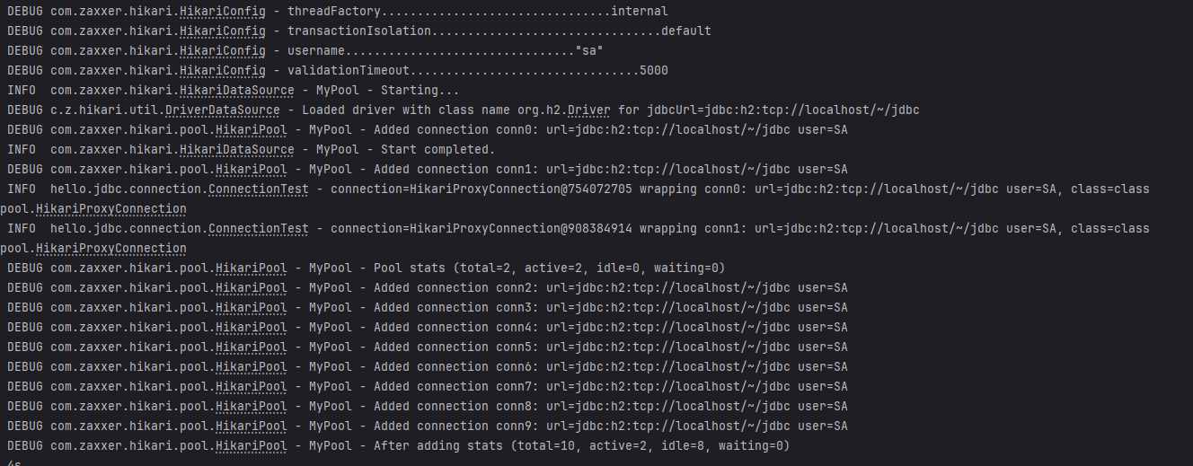 2025-01-11 03:47:18 DEBUG com.zaxxer.hikari.pool.HikariPool - - Added connection conn2: url=jdbc:h2:tcp://localhost/~/jdbc user=S