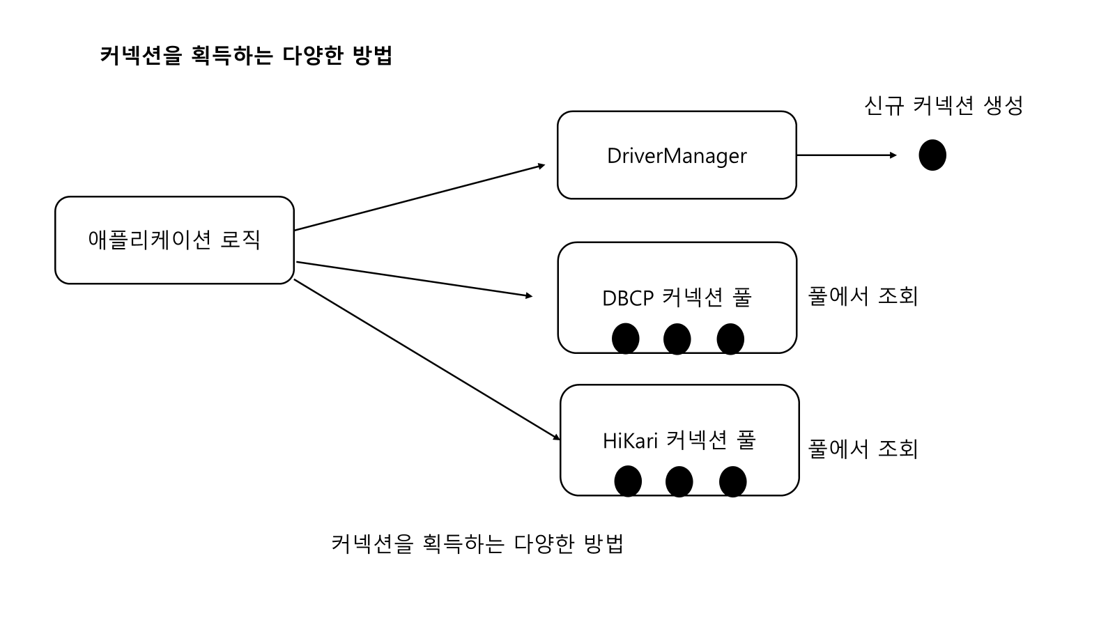 커넥션을 얻는 방법은 앞서 학습한 JDBC DriverManager 를 직접 사용하거나, 커넥션 풀을 사용하는 등 다양한 방법이 존재한다.