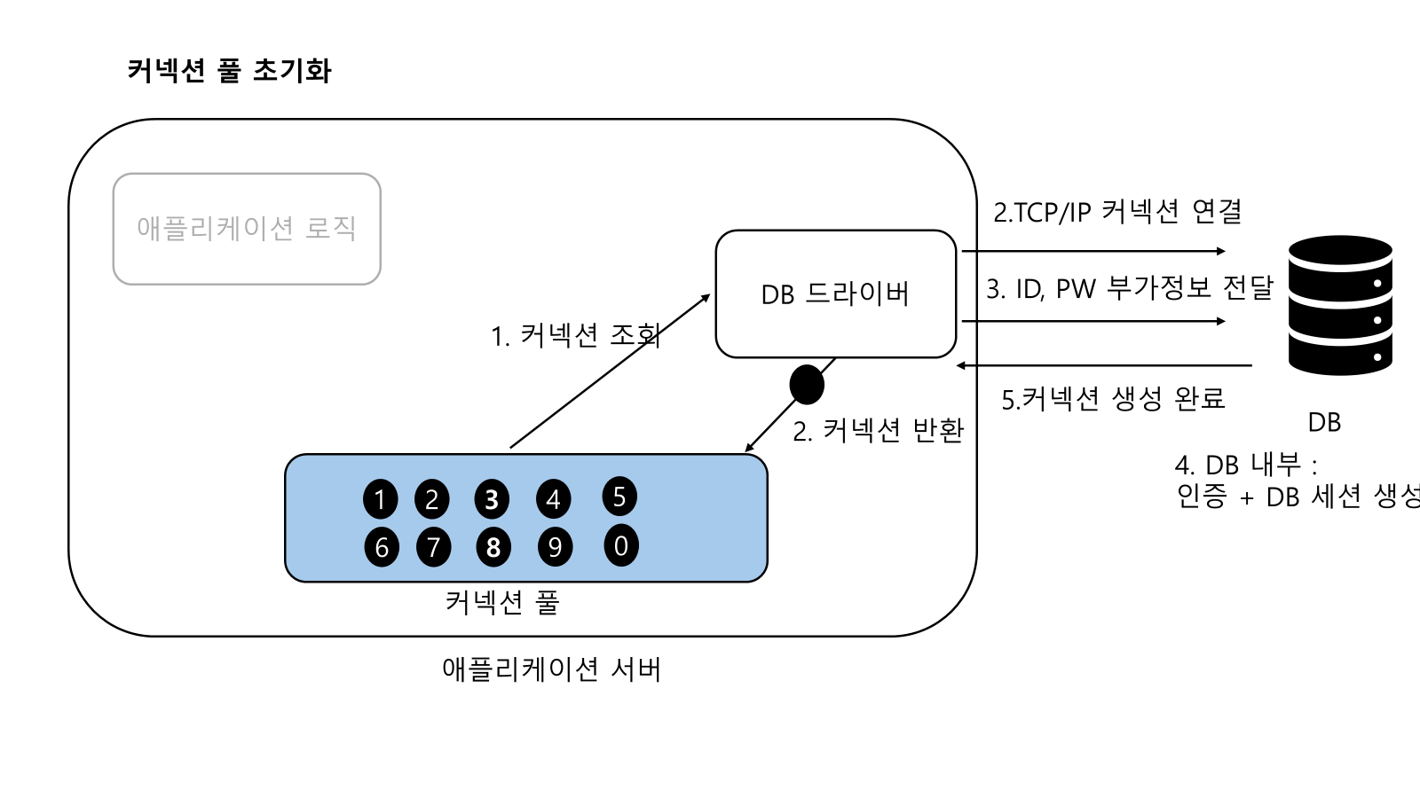 애플리케이션을 시작하는 시점에 커넥션 풀은 필요한 만큼 커넥션을 미리 확보해서 풀에 보관한다. 보통 얼마나 보관할지는 서비스의 특징과 서버 스펙에 따라 다르지만 기본값은 보통 10개이다.
