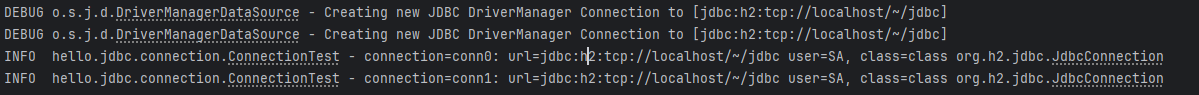 2025-01-11 03:53:46 INFO h.jdbc.repository.MemberRepositoryV1 - get connection=conn1: url=jdbc:h2:tcp://localhost/~/jdbc user=SA, class=class org.h2.jdbc.JdbcConnection