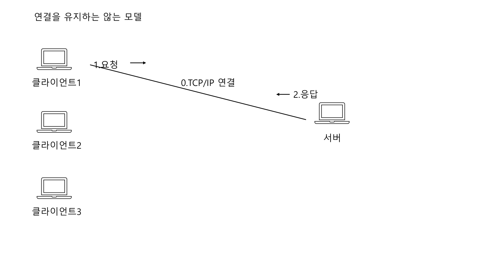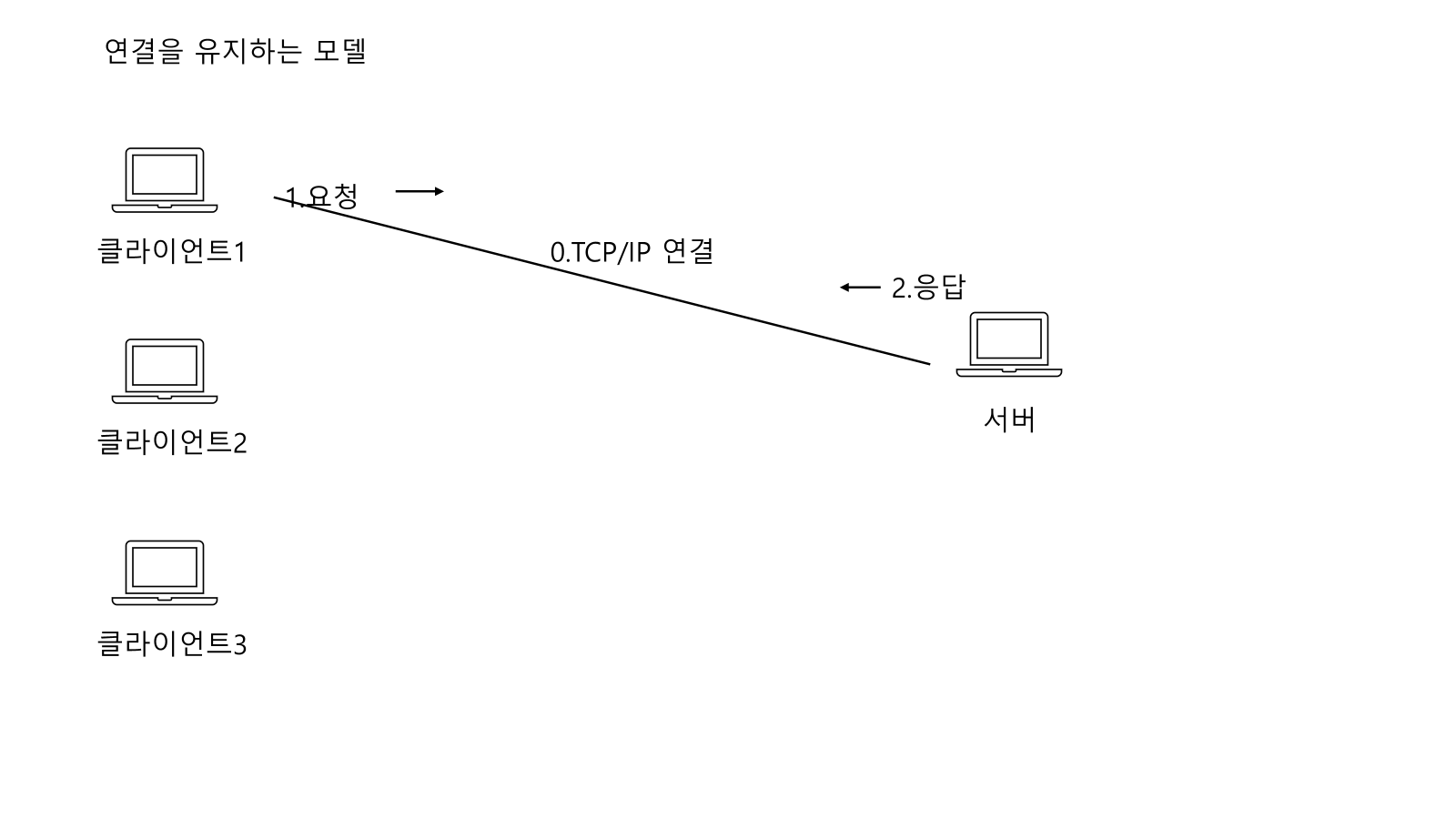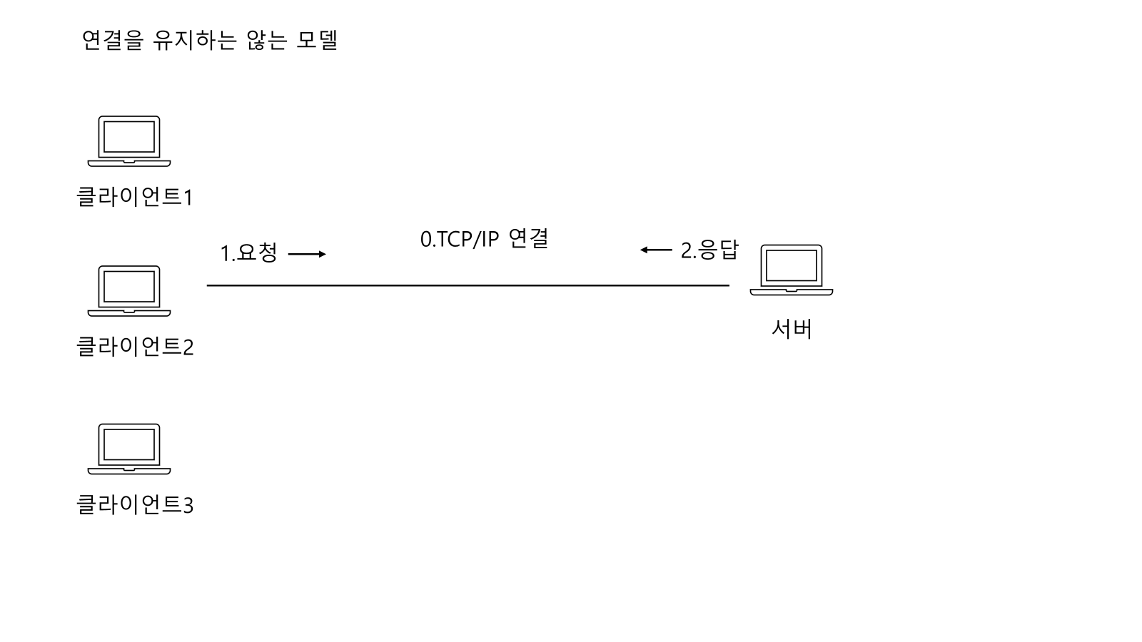 클라이언트1 과 서버와 TCP/IP 연결후 요청-> 응답 과정을 거친후 TCP/IP 연결을 끊어버린다.