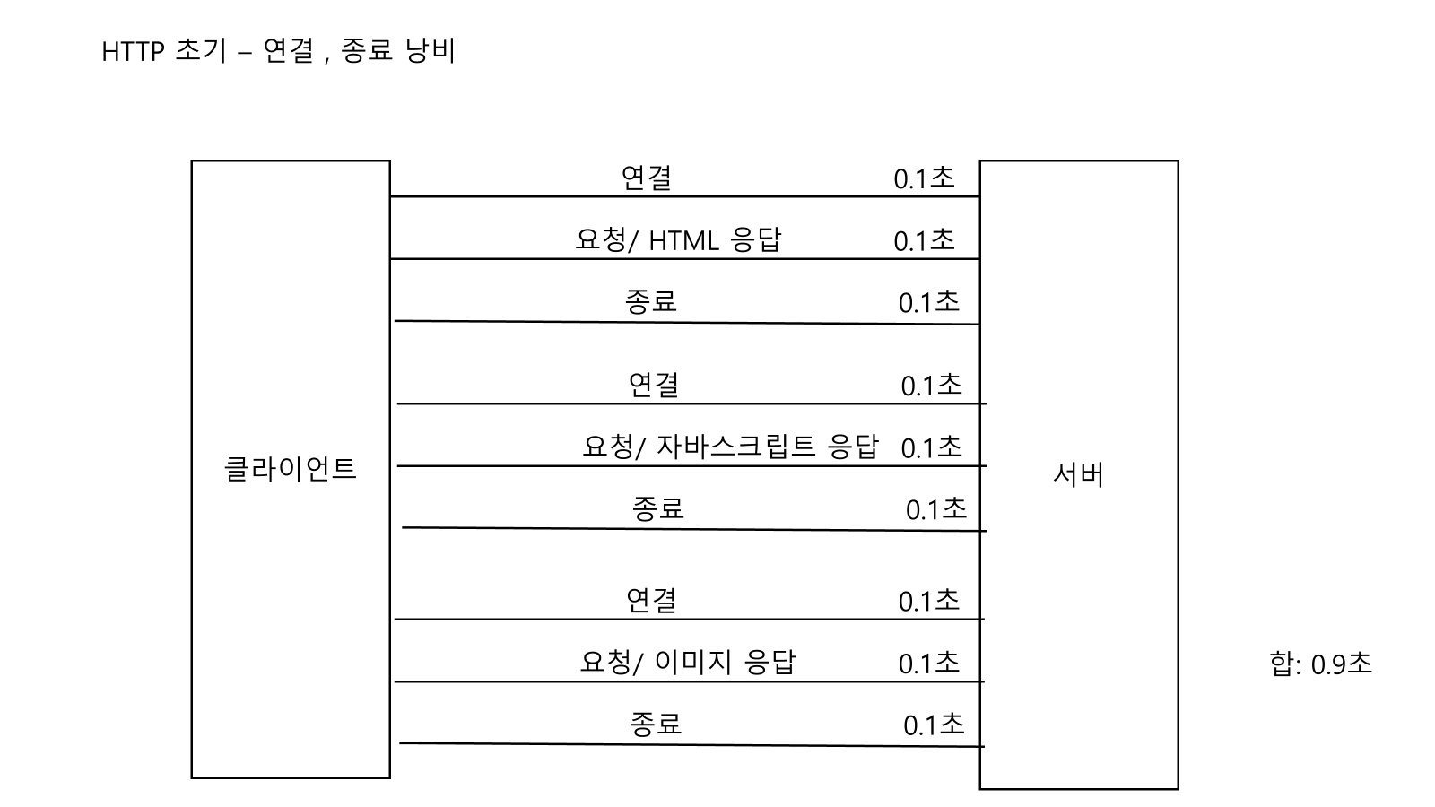 - 매 요청마다 TCP/IP 연결을 새로 맺어야 한다 - 3 way handshake 시간이 추가됨