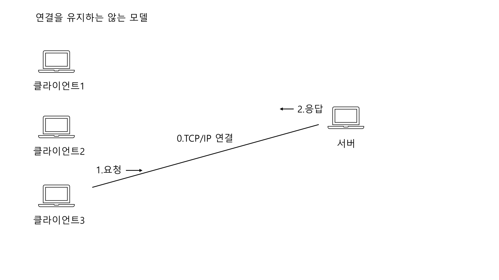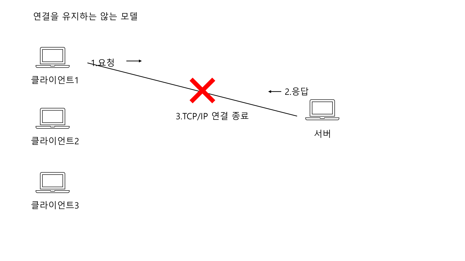 클라이언트3 과 서버와 TCP/IP 연결후 요청-> 응답 과정을 거친후 TCP/IP 연결을 끊어버린다.