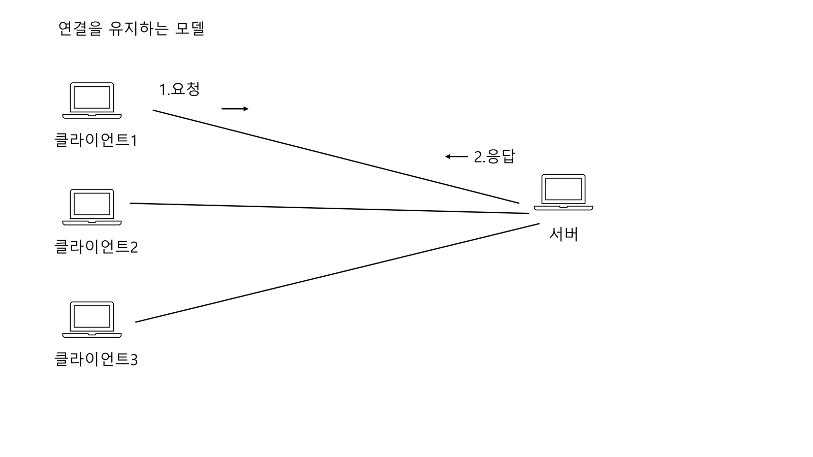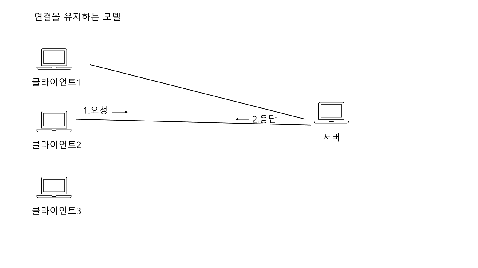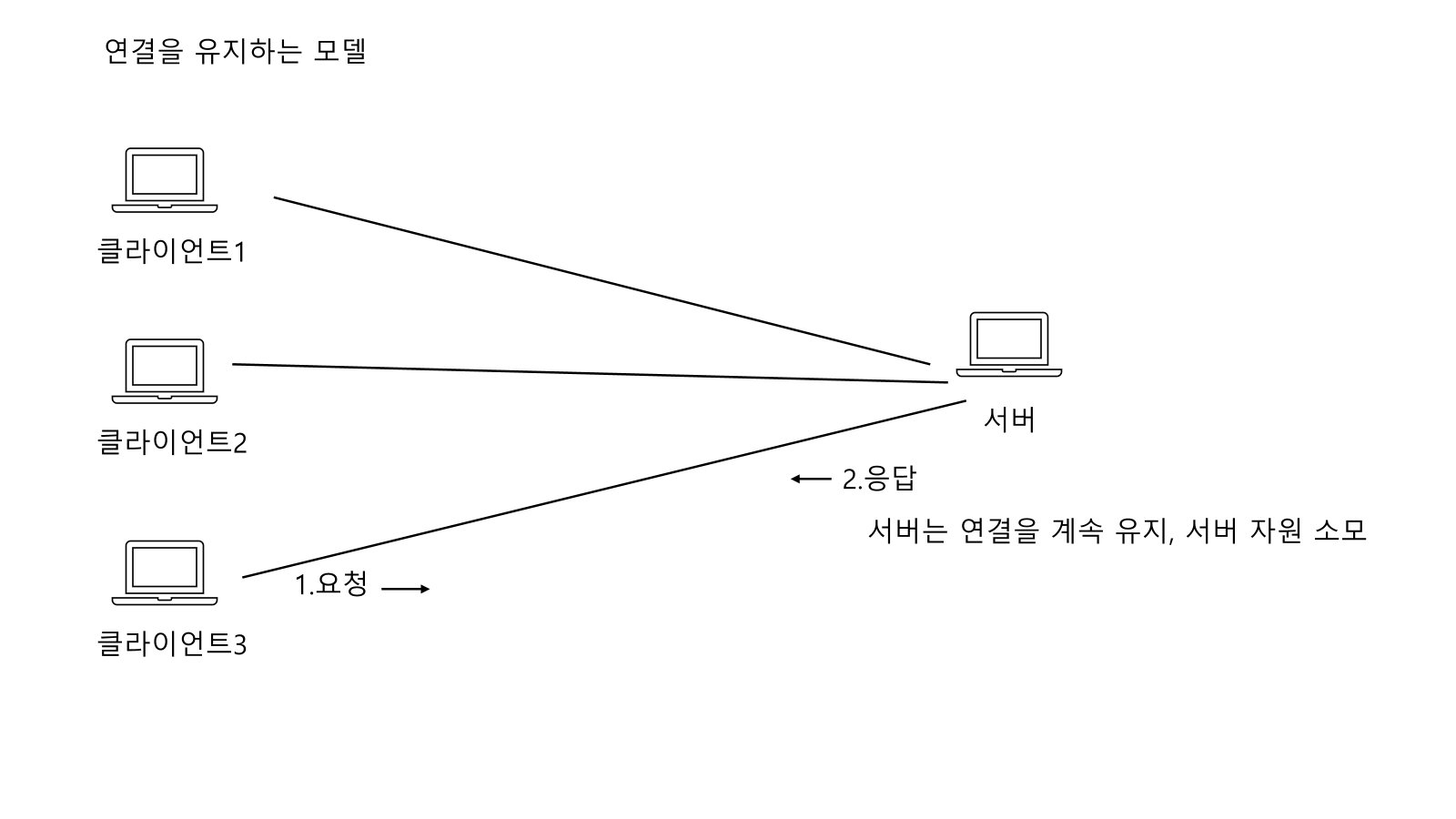 이떄 클라이언트 2, 3 을 사용하지 않아도 계속 서버에 연결을 하고 있어야한다는 단점이 있다.