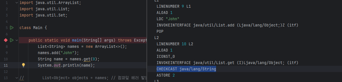 실제 바이트코드를 확인해보면 9번째 라인에서 John 이름이 셋팅된 이후 get 으로 꺼내올때 Object 타입으로 꺼내진것을 볼수 있다.