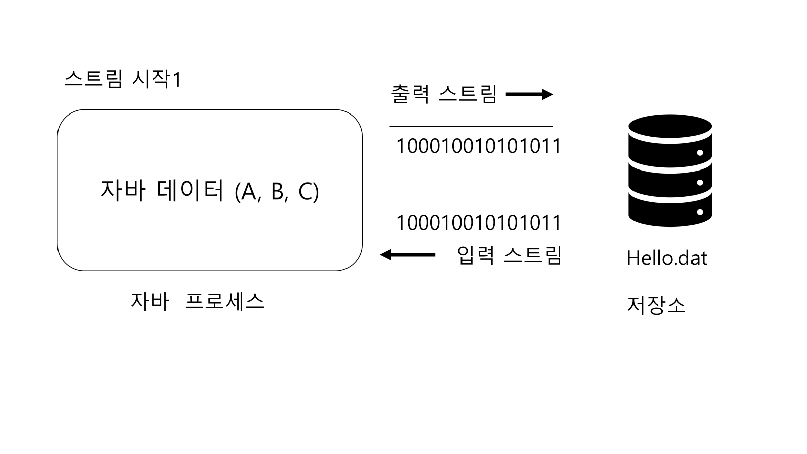 자바에서 데이터를 파일이나 네트워크 등을 통해 주고 받을 때 어떤식으로 통신하는지 알아보자 데이터의 통신 과정은 스트림으로 통신한다 자바가 가진 데이터를 hello.dat 라는 파일에 저장하려면 어떻게 해야할까?자바 프로세스가 가지고 있는 데이터를 밖으로 보내려면 출력 스트림을 사용하면 되고, 반대로 외부 데이터를 자바 프로세스 안으로 가져오려면 입력 스트림을 사용하면 된다. 참고로 스프트림을 단방향으로 흐른다. 스트림 시작 스트림 시작 - 예제1package io.start;import java.io.FileInputStream;import java.io.FileOutputStream;import java.io.IOException;public class StreamStartMain1_1 { ..
